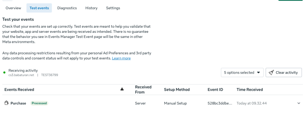 Test Id : didapat dari menu test event meta, khusus untuk test event capi
