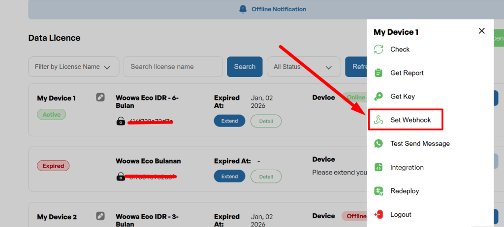 6. Masuk ke menu “Set Webhook” di wowaa